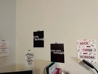 I have not painted the walls in the studio (because I haven’t decided on a color and if it should be a DIY) but at the same time the space above the computers is one that I see regularly from my crafting table so it was calling out for color. I decided to dig into my stash of washi (because what crafter doesn’t love washi) to add some color with some positive posters I had been hoarding.